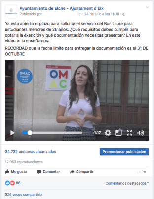 La difusión a través de RRSS está siendo muy satisfactoria: el vídeo inicial se ha lanzado las primeras 48 horas sin ningún tipo de apoyo económico para su difusión, a fin de comprobar el alcance viral orgánico del mismo. Los datos hablan por si mismos: 35.000 personas alcanzadas, 13.000 reproducciones, 86 interacciones (únicamente Me gusta o Me encanta) y 325 veces compartido. Para poder medir el resultado, tengamos en cuenta que el periódico líder indiscutible en la provincia, el diario Información, cuenta con unos 24.000 lectores diarios en el municipio de Elche.
